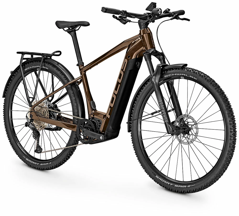 The FOCUS AVENTURA² with powerful Bosch Performance CX Smart E-drive offers a peak range of 750 Wh. The battery sits beautifully integrated in the down tube, but can be removed for charging. With luggage rack, mudguards, stand and light, the world is open to you, thanks to 100 mm suspension fork and mountain bike tires it also goes far beyond the city limits.