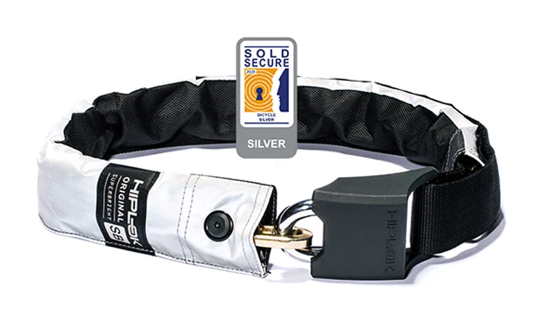 Le classique Hiplok parmi les antivols à chaîne portables – ici avec une enveloppe extérieure très réfléchissante