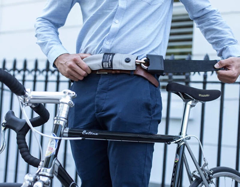 Tous les antivols à chaîne portables Hiplok disposent d’une fermeture brevetée en forme de ceinture qui permet de porter les antivols sur la hanche pendant le trajet, sans être verrouillé.