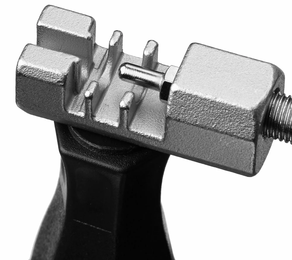 Le rivet à chaîne permet d’ouvrir ou de fermer les chaînes fermées par une tige de rivet. La construction fixe la chaîne pendant la pression, ce qui facilite l’extraction ou l’enfoncement précis de la goupille de chaîne. La force nécessaire est transmise par un mécanisme rotatif à la tige du rivet de chaîne afin de la faire sortir ou rentrer en douceur.
