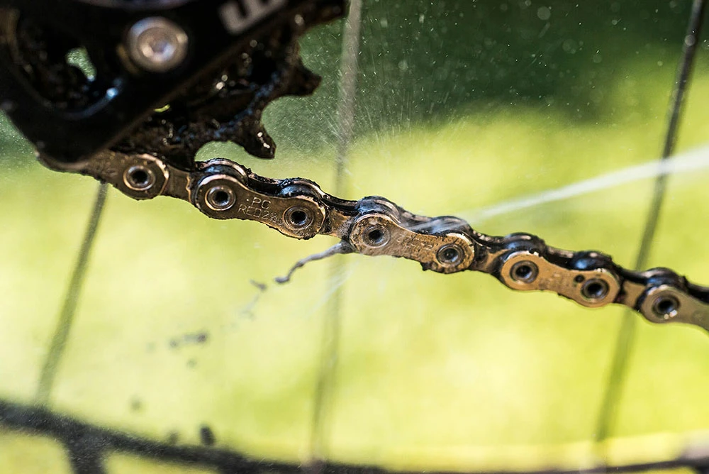 - Appliquer le nettoyant Bio Chain Cleaner sur la zone de la chaîne d’entraînement