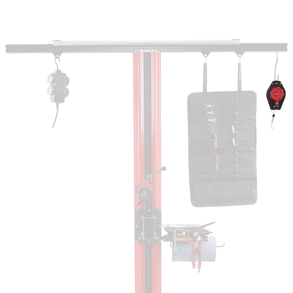 Le fabricant Nuton-Bike a développé des accessoires spécialement pour ce support de montage, par ex. une commande manuelle externe avec languette de suspension et grande longueur de câble ; un profilé de 140 cm de long pour la fixation d’autres accessoires ; une tablette à outils avec barre magnétique, plateau à outils et dérouleur pour les outils de nettoyage.une barre lumineuse LED avec interrupteur marche/arrêt ; une prise multiple pour quatre outils ou lampes alimentés par le secteur ; un sac à outils à suspendre ; une poulie de traction.
