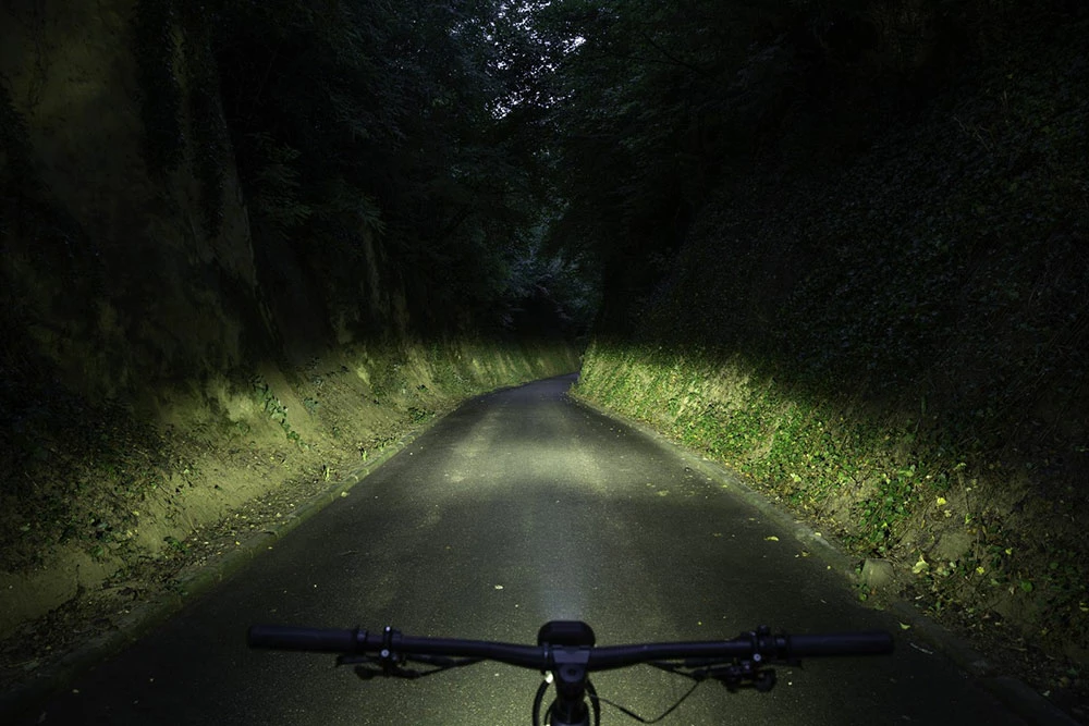 Lorsqu’un cycliste se penche dans un virage, le faisceau de croisement, qui est fortement limité à l’horizon d’éblouissement, s’incline sur le côté avec le cycliste, de sorte que la voie à suivre n’est que partiellement éclairée. En revanche, les feux de route brillants rayonnent bien au-delà de l’horizon d’éblouissement et la lumière pénètre dans le virage. Il en résulte un éclairage nettement amélioré de la voie dans les virages et donc une augmentation significative de la sécurité des cyclistes.