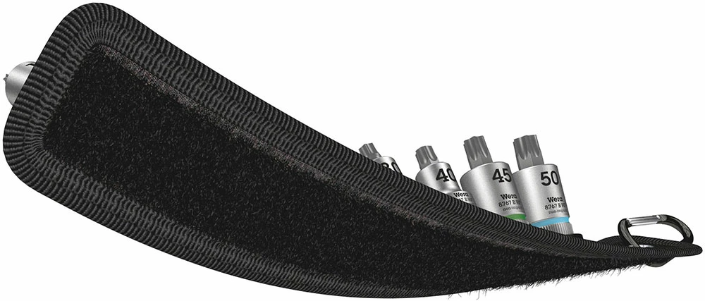 Sangle porte-outils en textile très résistant et design Wera, avec 9 douille-embouts, sur un espace réduit. Le mécanisme « Twist to Unlock », très souple, assure un maintien en toute sécurité et un retrait facile des douilles.
