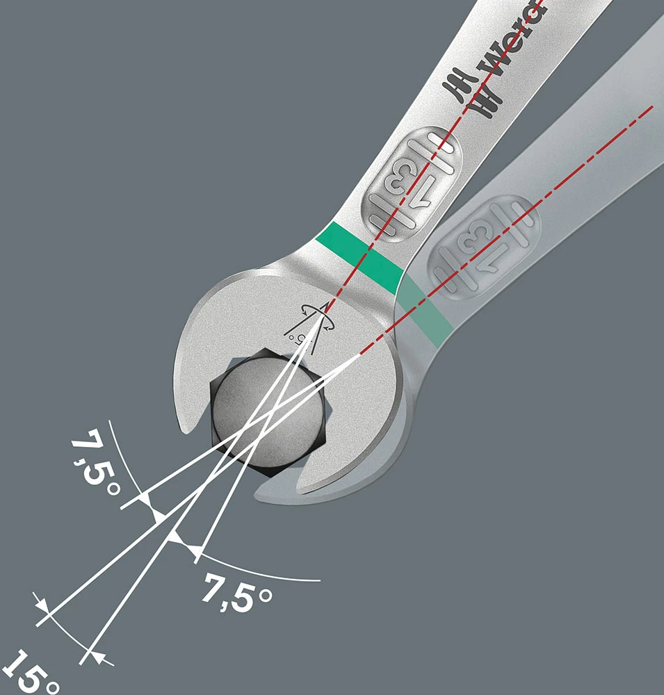 La clé mixte Joker6003 avec la forme particulière de sa fourche 12 pans et coudée à 7,5° double les possibilités d’ancrage lors de la rotation à 180° répétée de la clé dans l’axe longitudinal. Les écrous ou têtes de vis peuvent être «agrippés» tous les 15°. La Joker6003 trouve pour ainsi dire d’elle-même le point d’ancrage suivant à chaque rotation.