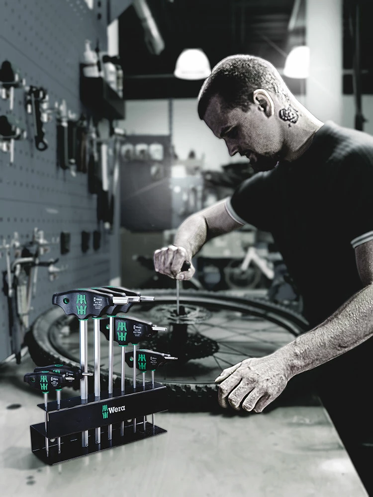 Jeu de tournevis 10pièces avec manche en T pour les cyclistes: la forme idéale du manche permet de transmettre des couples de serrage et de desserrage particulièrement élevés. La forme ergonomique du manche épouse bien la forme de la paume. Les doigts sont calés dans les arrondis. La main entière est en contact avec le manche et les déperditions par friction entre la main et le manche sont évitées.